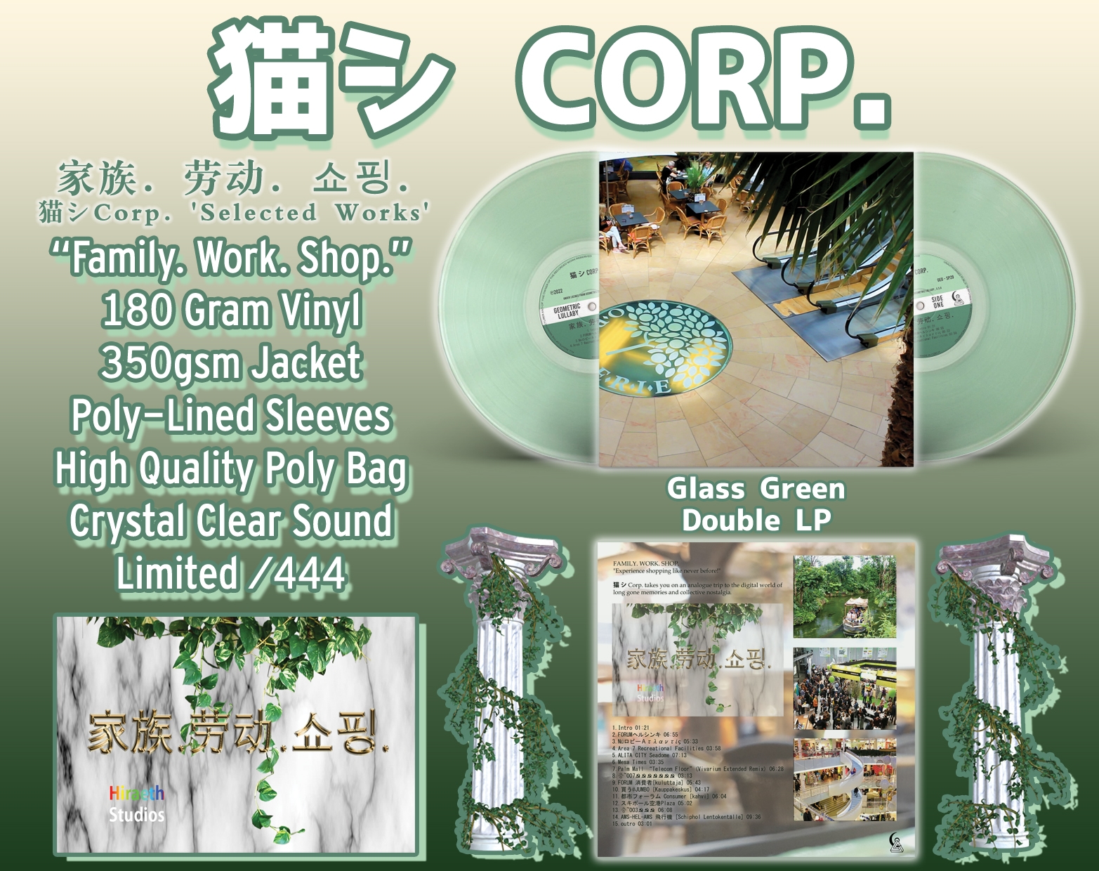 “Experience shopping like never before!” – Corp’s full-length mallsoft film “家族. 劳动. 쇼핑.” (Family. Work. Shop.) is now available on 2LP! A compilation of selected tracks, with some tracks slightly remixed for the film.